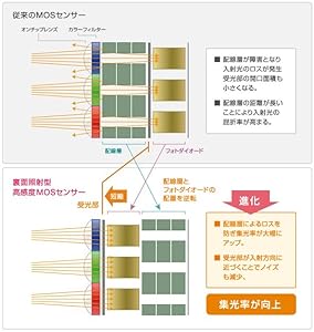 暗い場所もクリアに撮影。225万画素 裏面照射型 高感度MOSセンサー搭載。 ???センサー内の配線層とフォトダイオードの配置を逆転させた裏面照射型 高感度MOSセンサーを採用。
